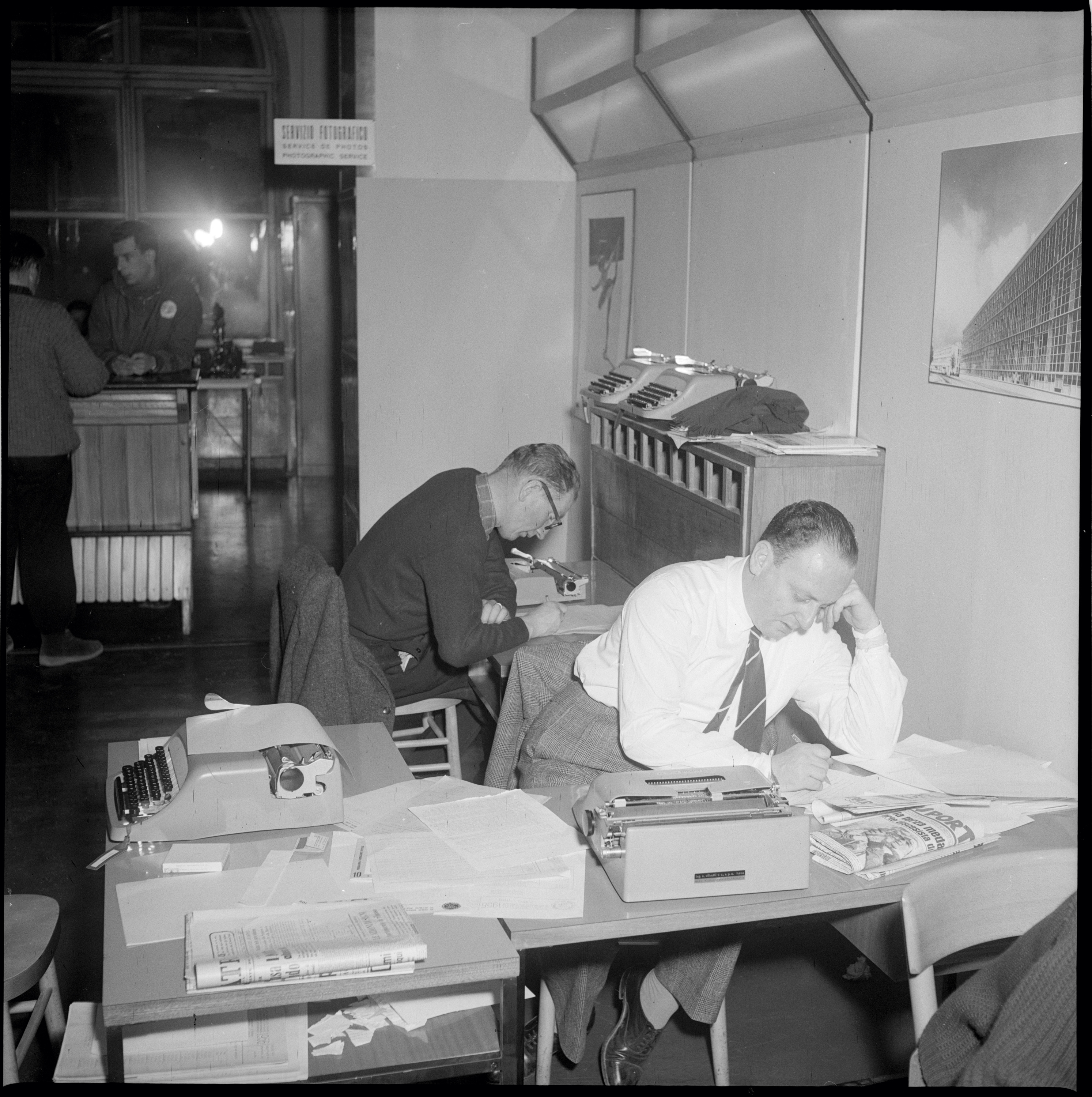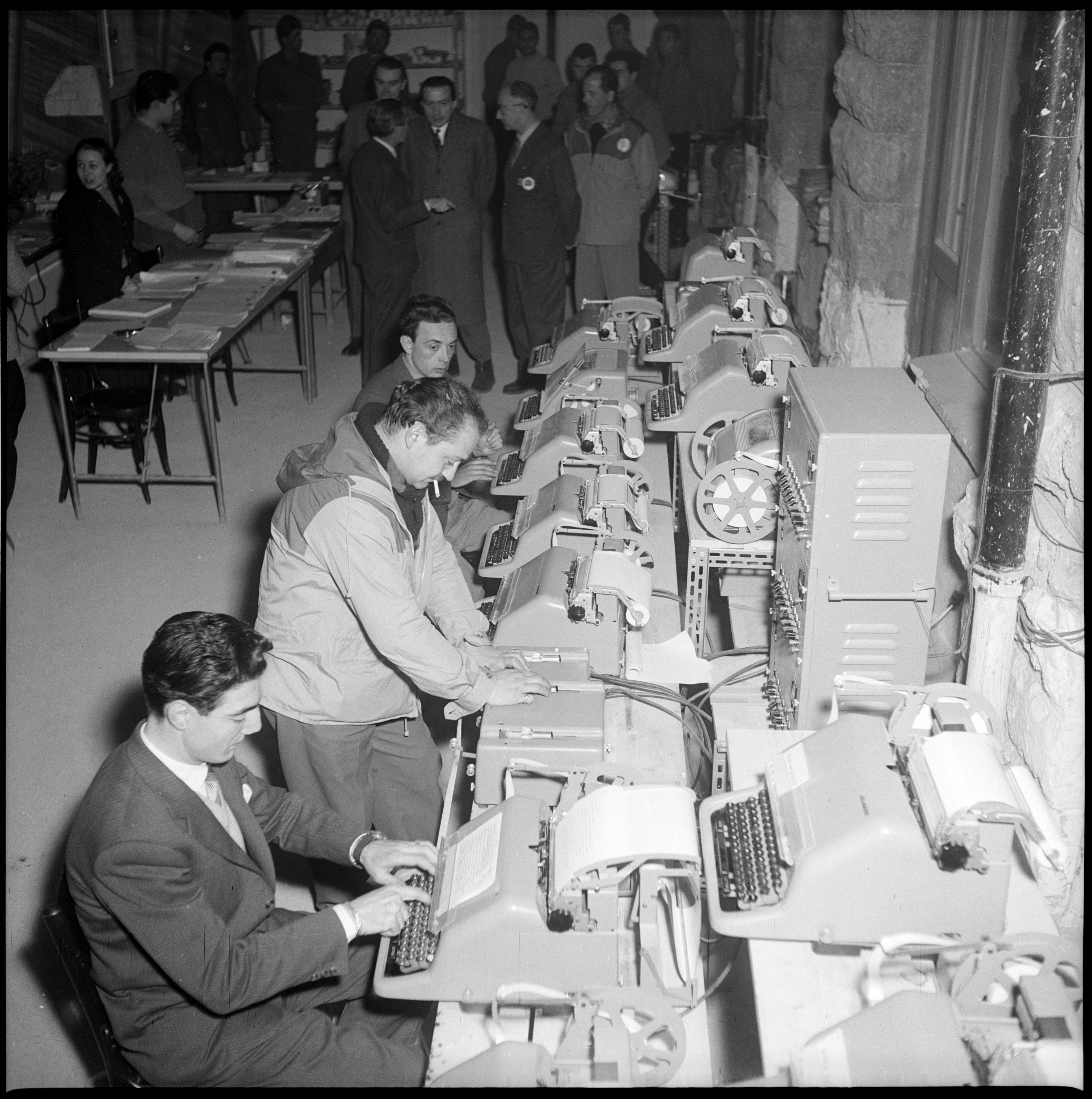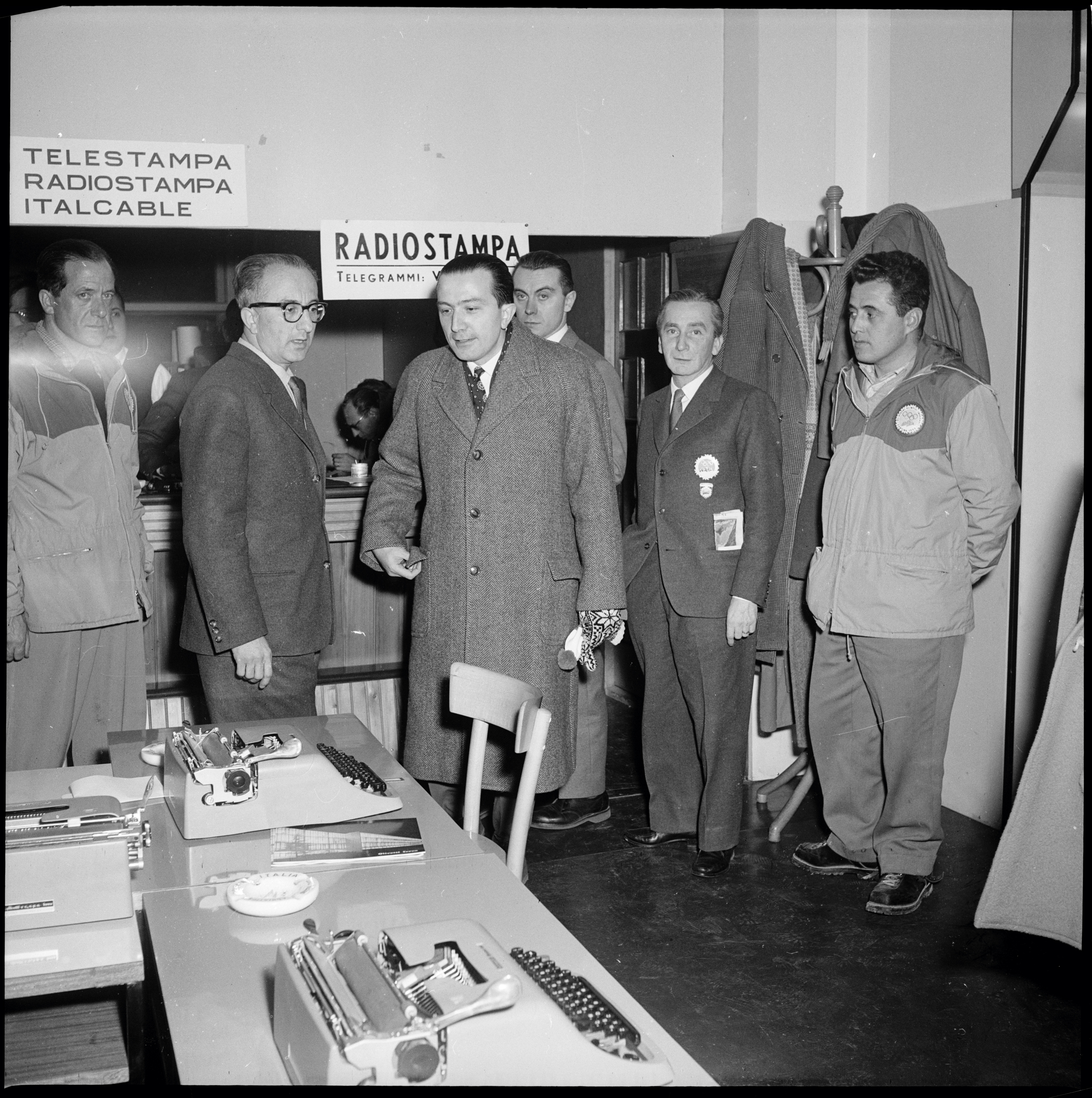 1. Il reparto delle telescriventi del Centro per la stampa ospitato all'albergo Savoia di Cortina d'Ampezzo durante i VII Giochi Olimpici Invernali; sullo sfondo il direttore del Centro per la stampa, Giuseppe Sabelli Fioretti, insieme al ministro delle Finanze Giulio Andreotti, 5 febbraio 1956