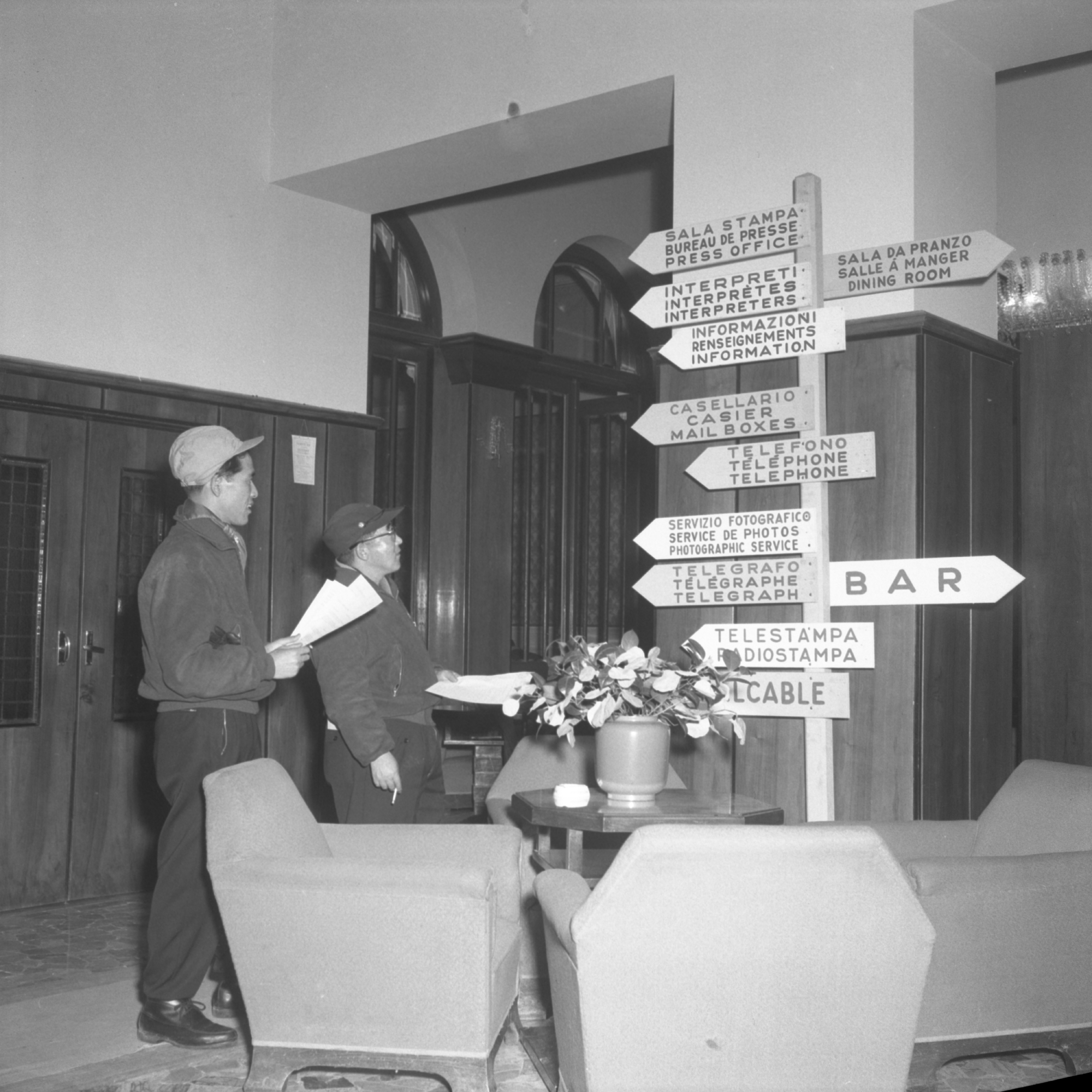 3. Segnaletica dei servizi offerti all'Albergo Savoia dove è ospitato il Centro per la stampa, 21 gennaio 1956