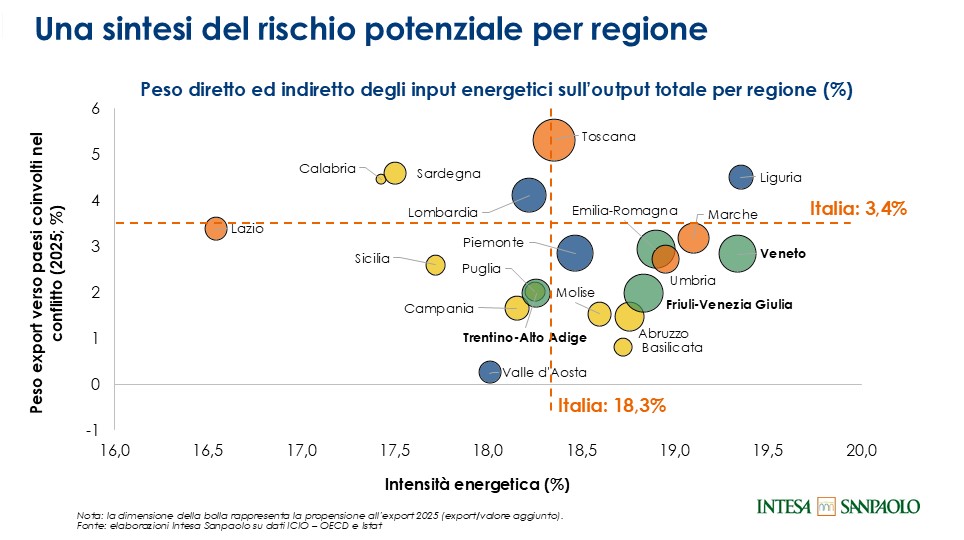 Il Research Department di Intesa Sanpaolo ha quindi elaborato un’analisi che incrocia l'esposizione commerciale di ciascuna regione italiana verso i paesi coinvolti nel conflitto con l’incidenza dei costi di gas ed elettricità sul valore della produzione, utile per comprendere la vulnerabilità potenziale al rallentamento delle esportazioni nell’area mediorentale e ai rincari energetici di ciascuna regione italiana.
