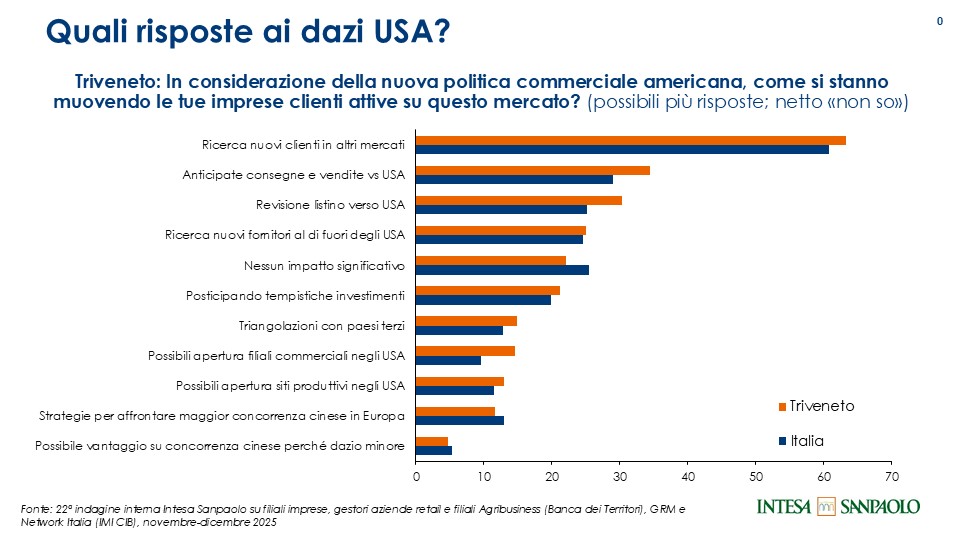 All’introduzione dei dazi USA le imprese esportatrici italiane hanno risposto con più contromisure, le principali delle quali sono state la ricerca di nuovi clienti in altri mercati, l’anticipo delle consegne e delle vendite sul mercato americano, la revisione dei listini prezzi per i clienti USA e la ricerca di nuovi fornitori al di fuori degli USA.