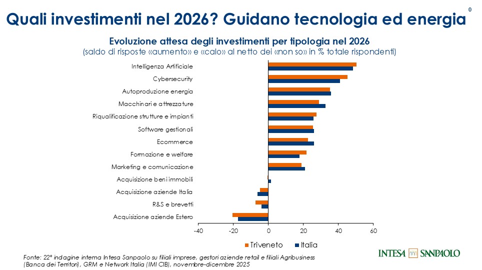 In un contesto economico profondamente mutato e in continua trasformazione, secondo il Research Department di Intesa Sanpaolo emerge come le imprese italiane siano sempre più consapevoli che la competitività si gioca sul fronte dell’innovazione, con nuovi investimenti nel digitale (intelligenza artificiale, cybersecurity, nuovi software gestionali), nell’autoproduzione di energia da fonti rinnovabili, nella riqualificazione di macchinari e strutture e nella formazione.