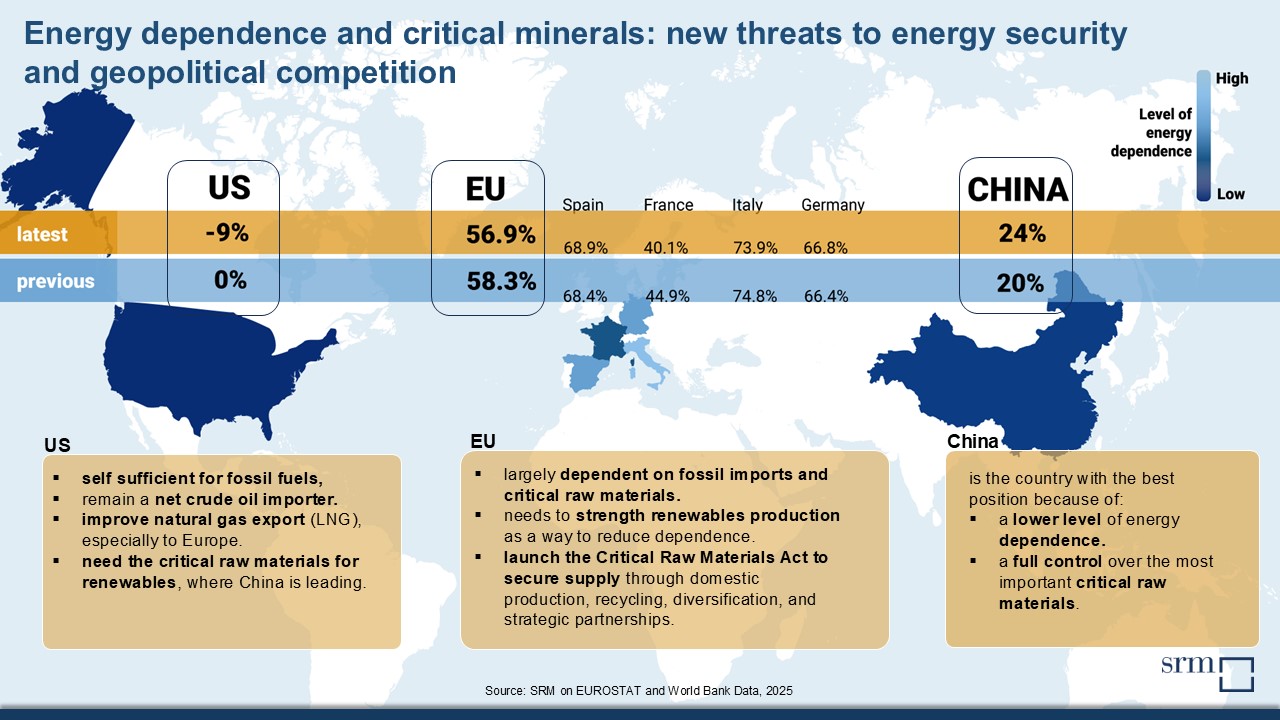 Gli Stati Uniti sono autonomi dal punto di vista delle fonti fossili, mentre dipendono dall’estero per molte materie prime e per gran parte delle cosiddette terre rare. L’Europa dipende dall’estero sia per le fonti fossili sia per le terre rare, mentre la Cina ha una bassa dipendenza da fonti fossili esterne e ha un controllo pressoché totale del mercato mondiale delle terre rare.